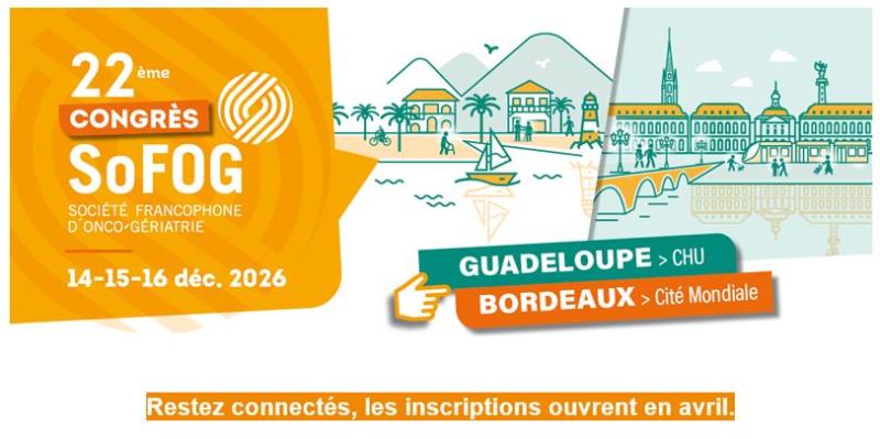 À l'heure où le vieillissement de la population s'impose comme un enjeu majeur de santé publique, l'oncogériatrie est plus que jamais au cœur de nos pratiques. La population âgée et celle des territoires ultra-marins sont deux populations spécifiquement ciblées par le plan cancer 2026 dans le but de garantir un accès équitable pour tous. Dans ce contexte, la SoFOG est très heureuse d'organiser le Congrès d'oncogériatrie 2026 dans un format exceptionnel bi-site au nouveau CHU des Abymes (Guadeloupe) et à la Cité Mondiale de Bordeaux, du 14 au 16 décembre