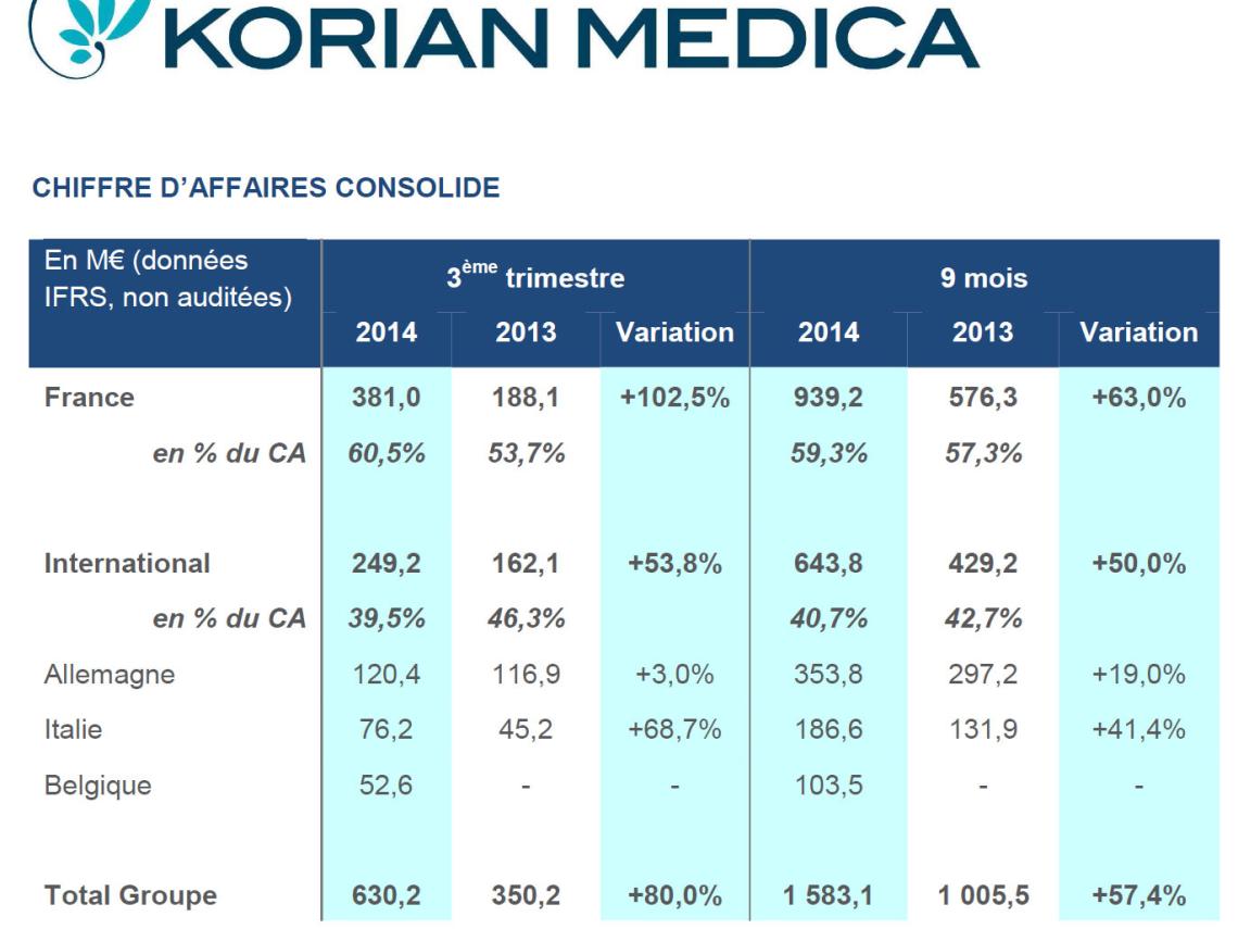 Korian - Medica a réalisé au 30 septembre 2014 un chiffre d'affaires consolidé de 1 583,1 M€, enregistrant ainsi une très forte hausse de 57,4%. Cette croissance s'explique en grande partie par l'intégration de Medica dans le périmètre de consolidation du Groupe à compter du 1er avril 2014.
